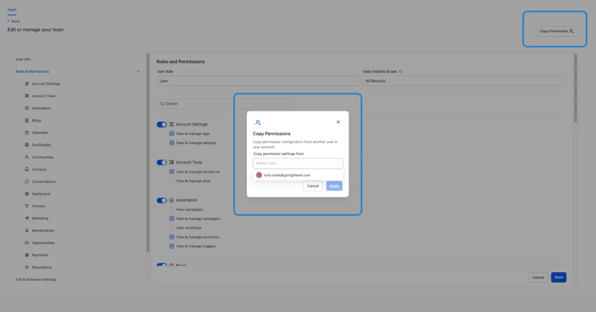Account admins can copy a user’s granular permissions to another user. For example, when Bob joins the sales team, the admin can clone Alex’s permissions to Bob.