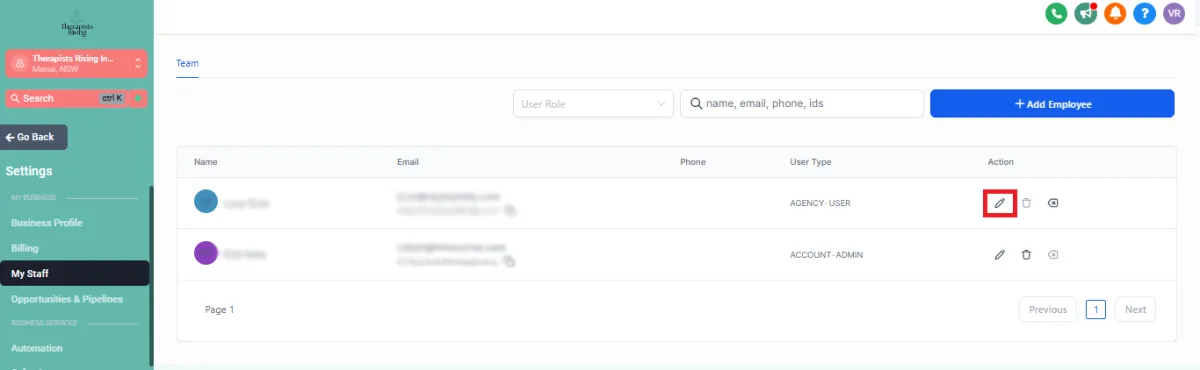 Navigate to Settings > My Staff.