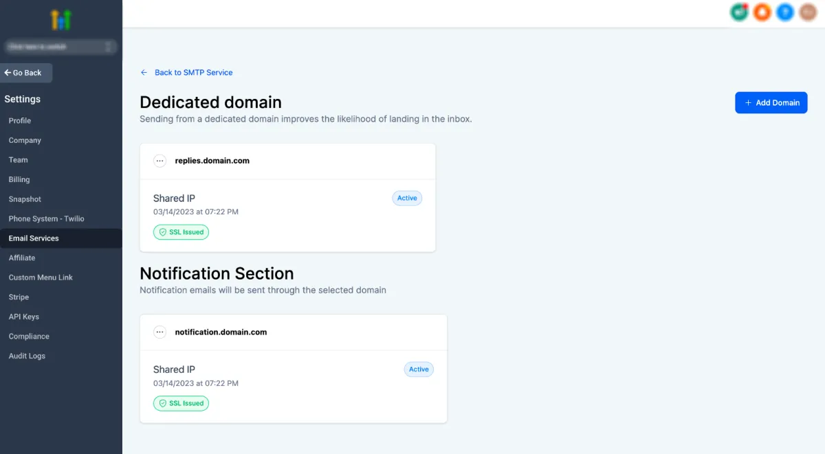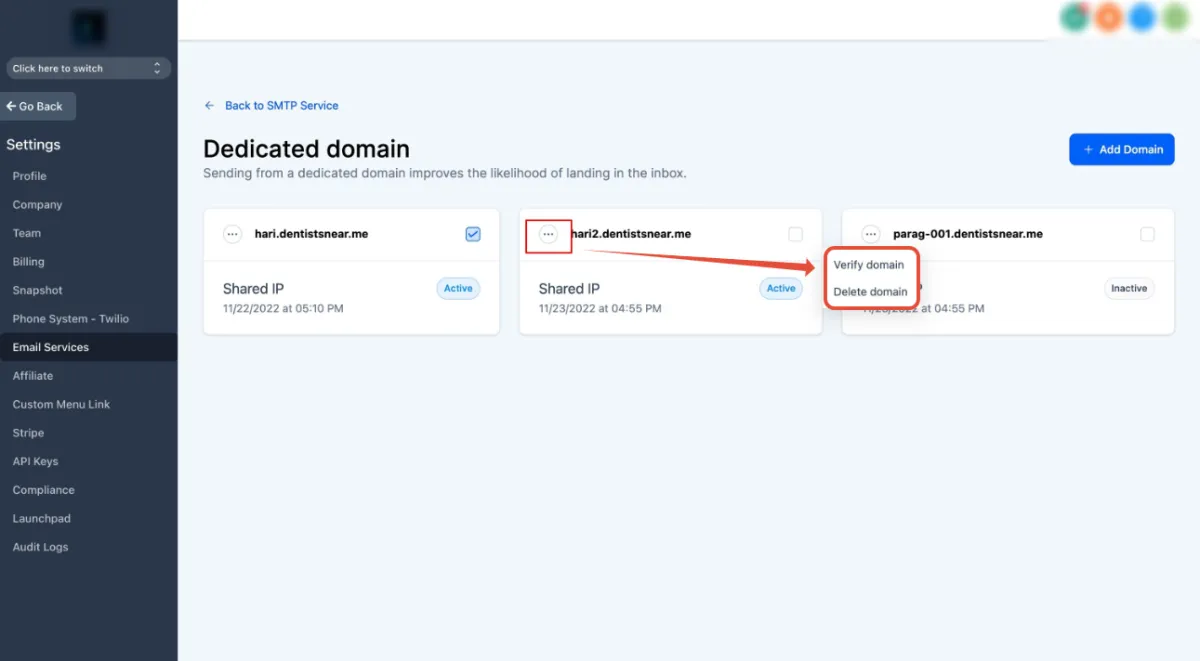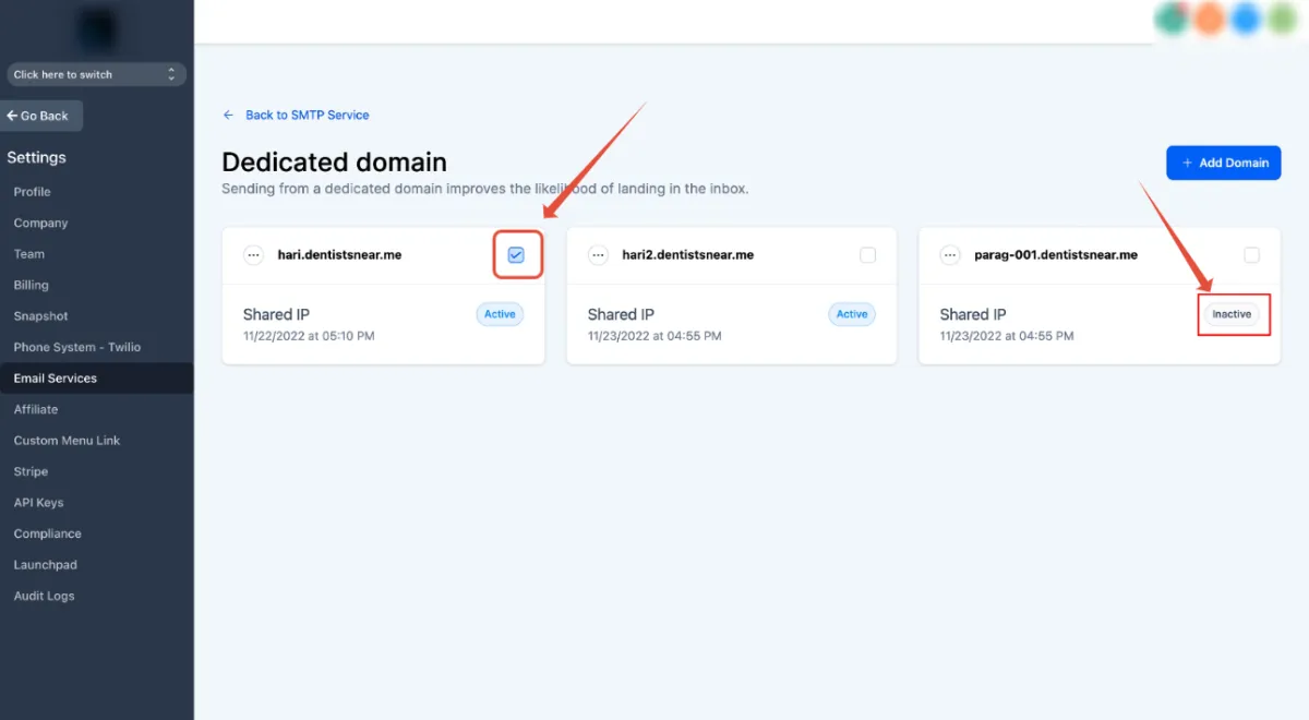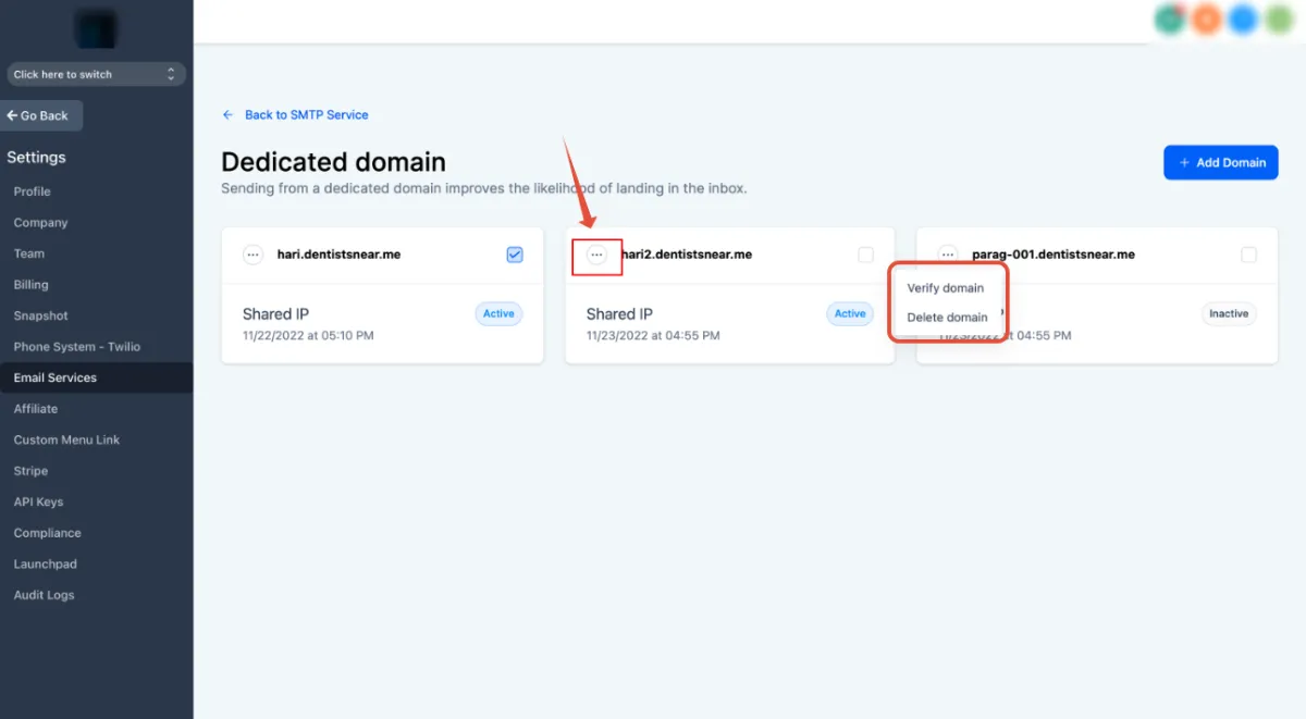 1. Navigate to Settings - > Email settings - > Domain services
