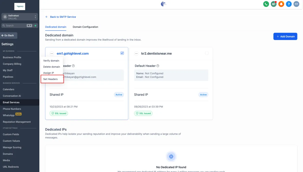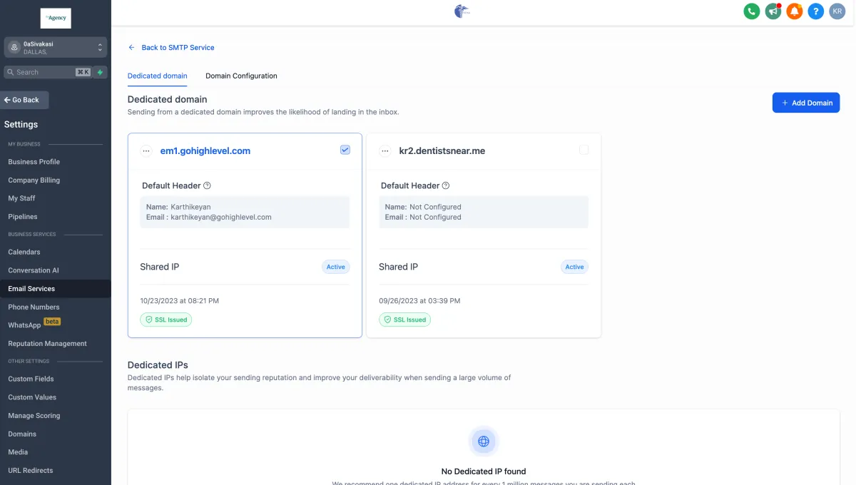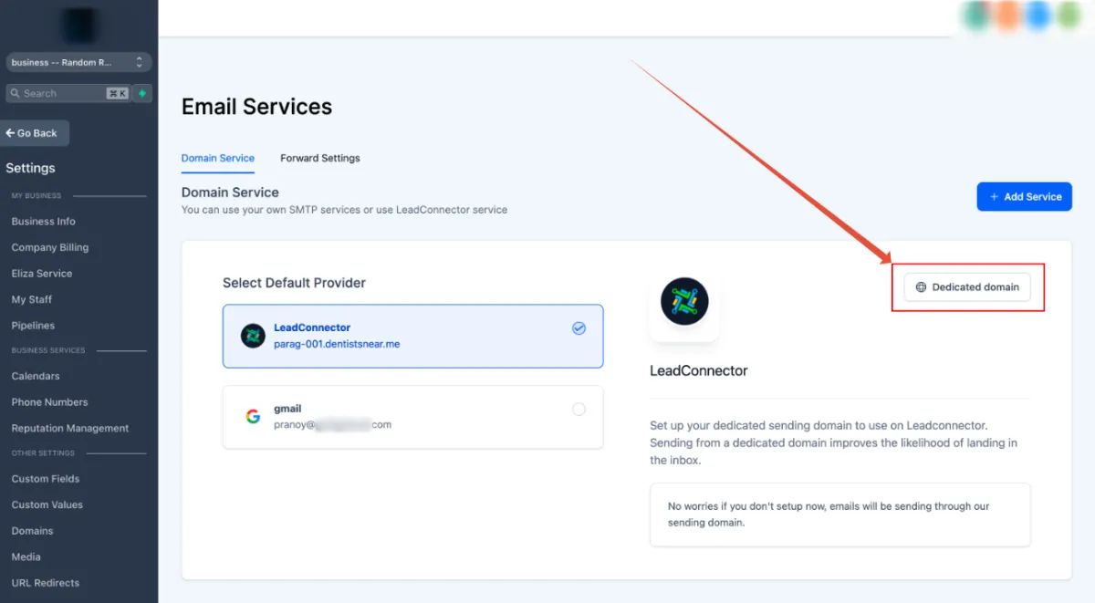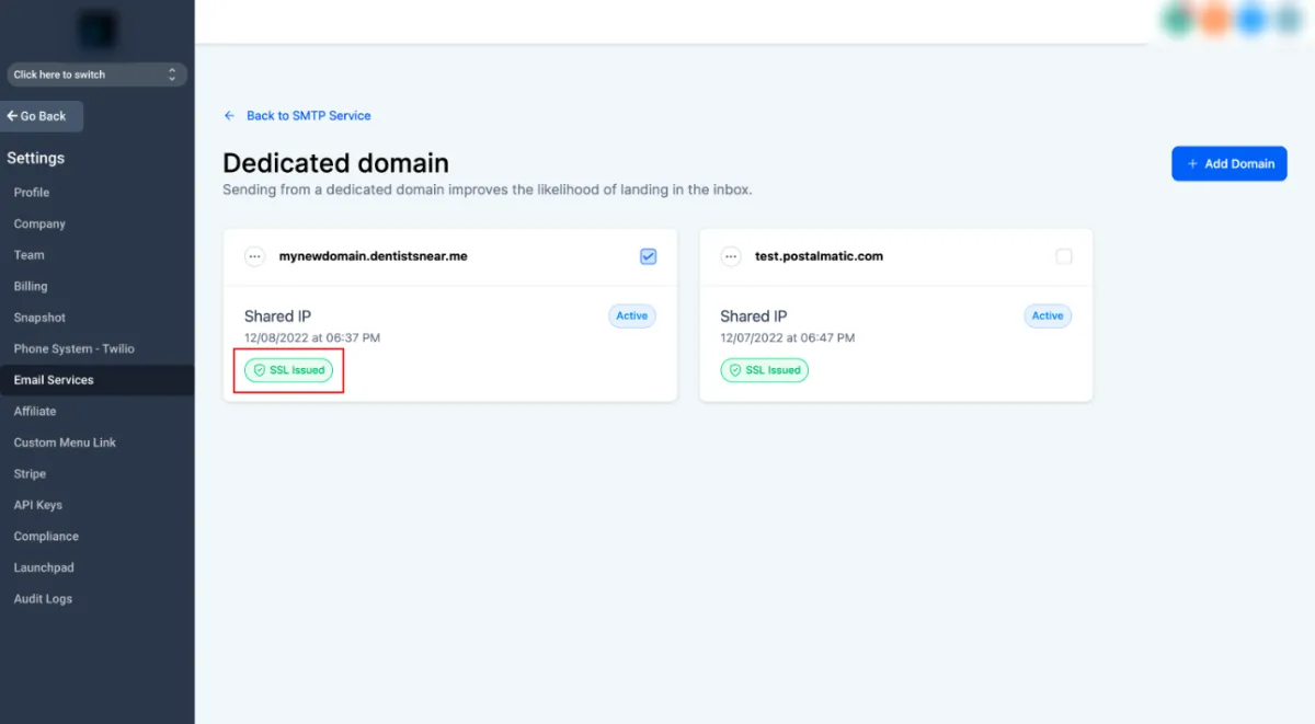 1. Navigate to Settings - > Email settings - > Domain services