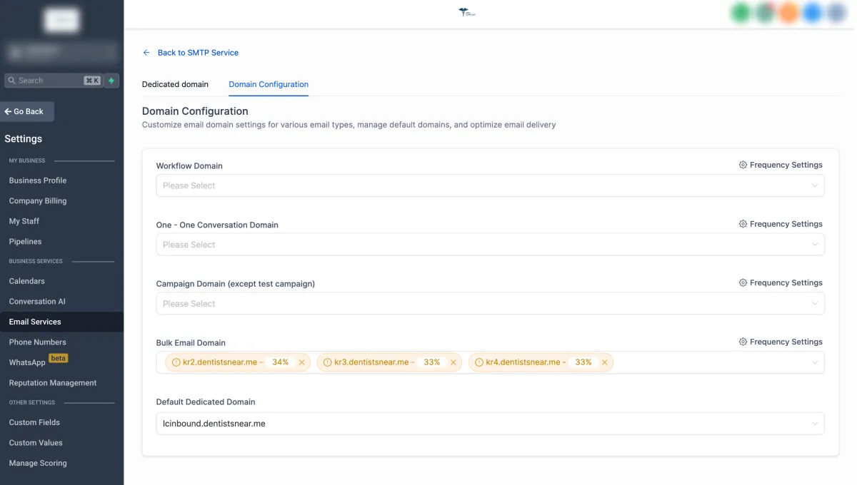 If you'd like to use different sending sub-domains for things like Workflows, Email Campaigns, Bulk Action Emails, and Manual 1-to-1 emails, you can configure that by navigating to Account Settings - Email Service -> SMTP Service -> Dedicated Domain and IP -> Domain Configuration