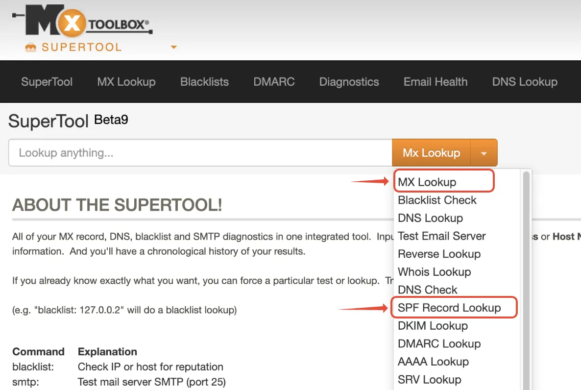 We can look up the domain MX and SPF record using