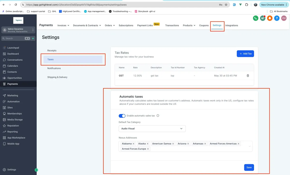 Enable Automatic Taxes -> Enter in all the details required