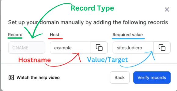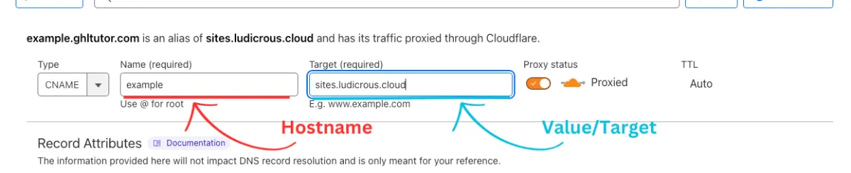 Input the Hostname into the “Name” field and Value/Target into the “target field"