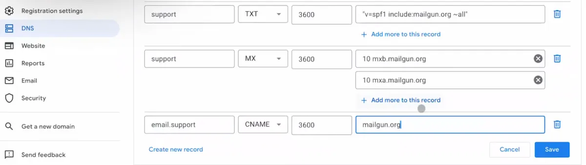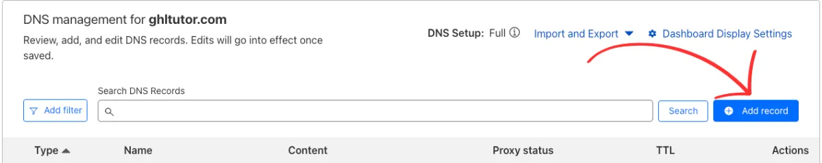 Now you open your DNS provider of choice and add the records in. Adding records are much the same, with some variation based on the provider. Go to your DNS manager and click add record.