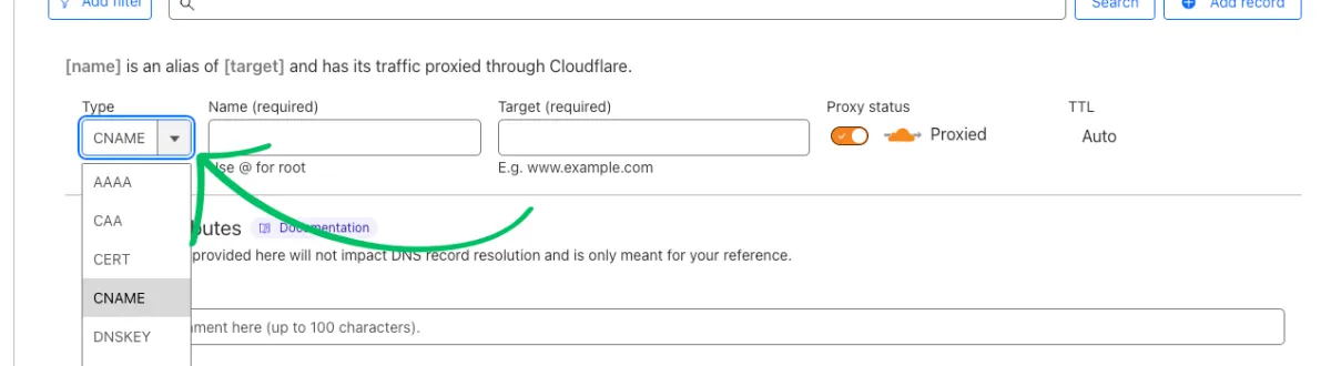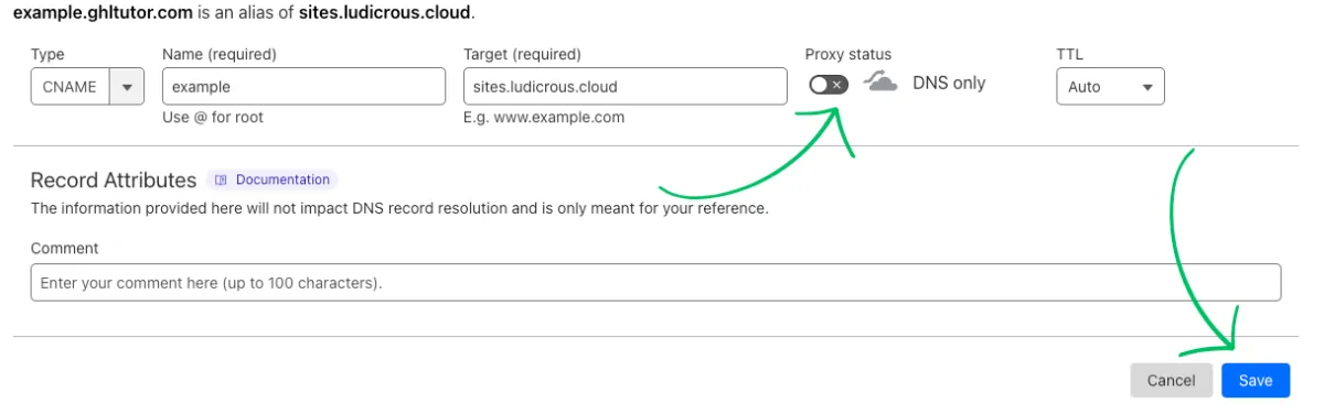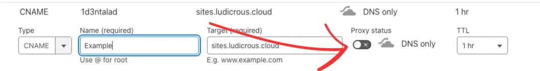 Save the record. If utilizing Cloudflare the Proxy Status will need to be toggled off.